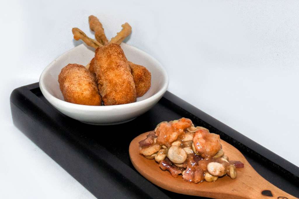 tras el traslado de local (Avda. Almirante León Herrero, 6), Croqueta de habitas tiernas con jamón, langostinos a la marinera y crujiente de tagarnina.