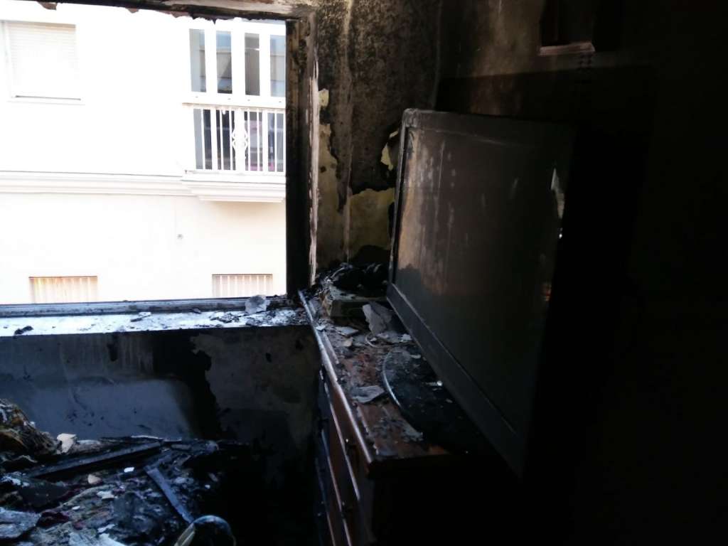 Se recibió el aviso por parte de la Sala de Emergencias de que sale humo por el cristal de dicha vivienda, desconociéndose en un principio si había personas atrapadas en su interior. Los vecinos del edificio intentaron ayudar y sofocar en parte el incendio de tal manera que cuando Bomberos llega los miembros de la unidad familiar, seis en total, se encontraban ya fuera de la vivienda y sin consecuencias ni daños personales. El incendio, por causas desconocidas, se localiza en uno de los dormitorios, de pequeñas dimensiones, afectando fundamentalmente a cortinas, colchón y otros enseres de la misma. El humo y el hollín también afectan a paredes y techo de la habitación. El resto de la vivienda, sin embargo, no sufre ninguna consecuencia del accidente. Se procede a terminar de extinguir el resto pendiente del incendio y a la ventilación correspondiente de la zona con turboventilador. Se precinta además la puerta de la habitación dañada por lo que la familia puede permanecer en la vivienda sin problema alguno. Se notifica también a la Policía Local los daños ocasionados y el material afectado.