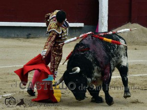 En el primero de su lote el torero Isleño ha sufrido una fuerte voltereta contra la barrera sin consecuencias importantes. Justo antes de empezar el trasteo con la muleta el astado hizo por él y lo volteó contra la barrera, afortunadamente todo quedo en un susto.
