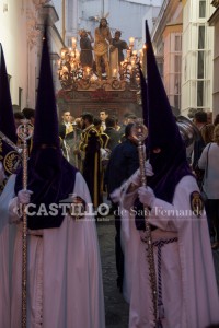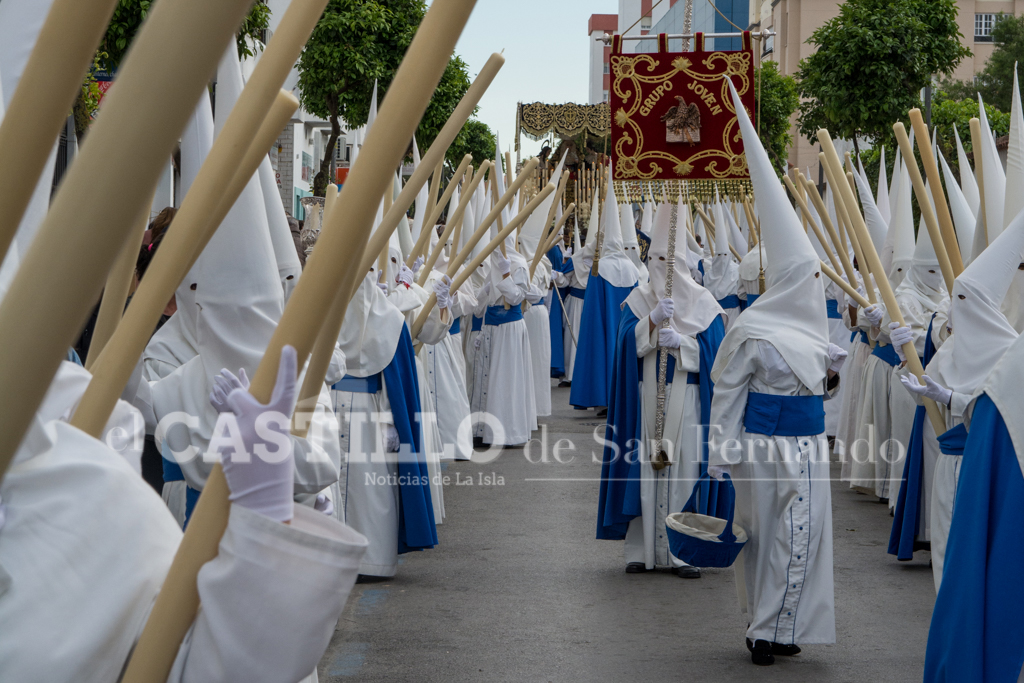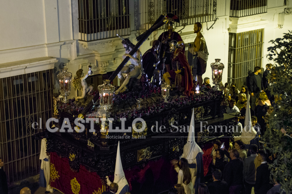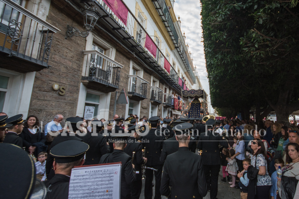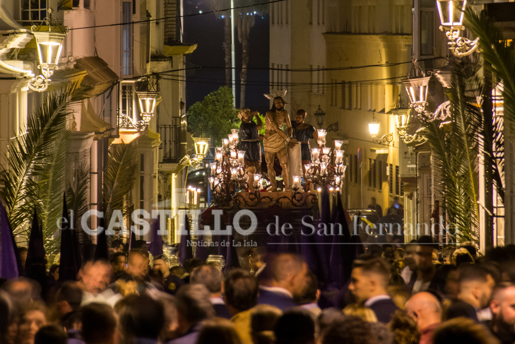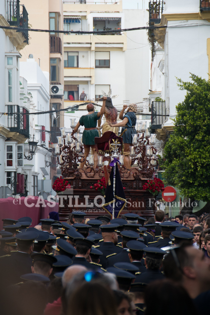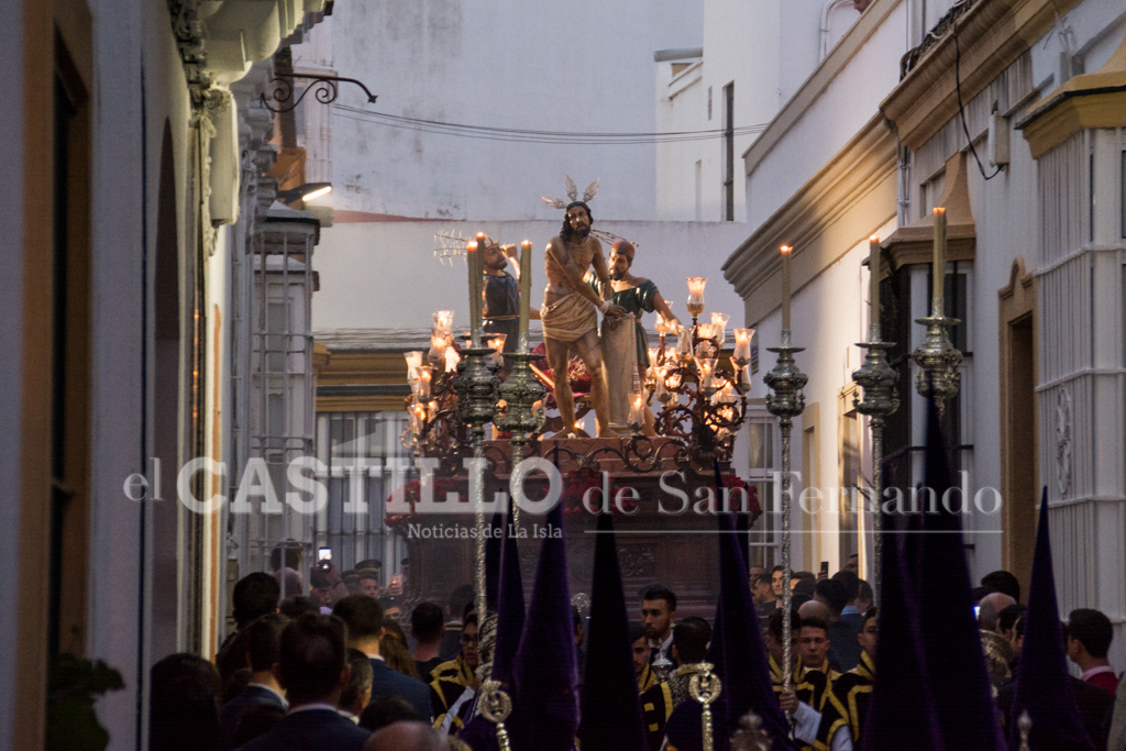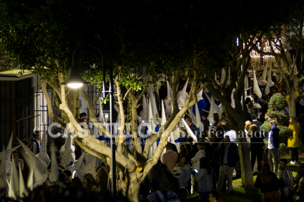 Y a las 18,20 se abrían las puertas de la Iglesia Mayor isleña par dar paso a la Hermandad de Columna, acompañada de sus hermanos con sus hábitos blancos y con capirotes de terciopelo morado, y a los sones la A.M. Nuestro Padre Jesús Nazareno de La Algaba, este año contaba con el estreno en el paso del Señor de la silla jamuga y sobre ella una clámide, realizada por el Taller Virgen del Carmen, de nuestra ciudad. El paso de la Virgen de las Lágrimas era acompañado por la Banda Enrique Montero de Chiclana.