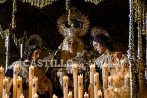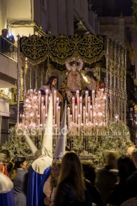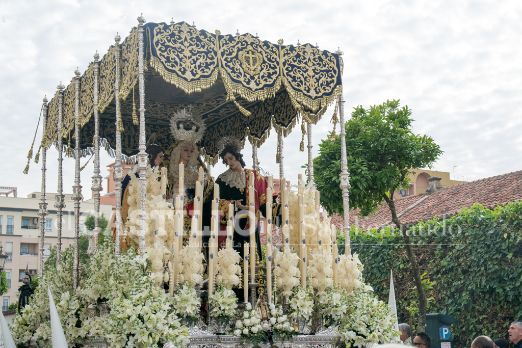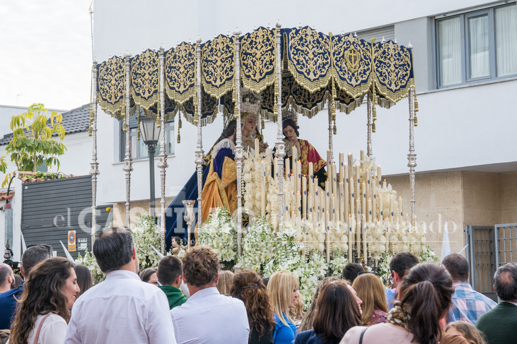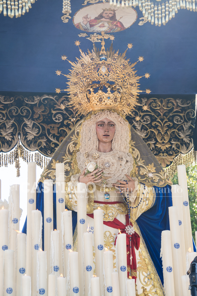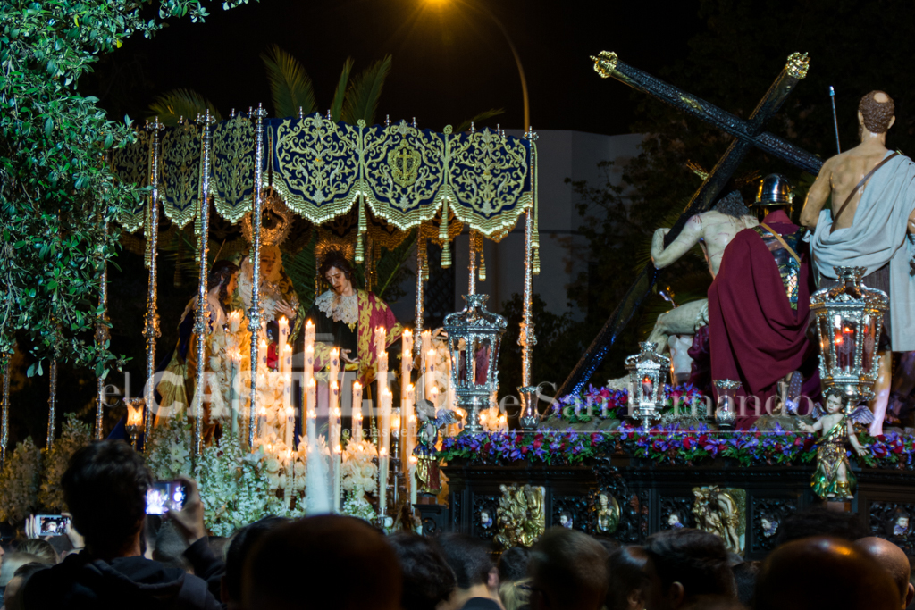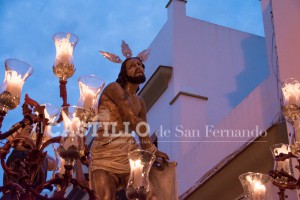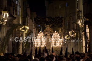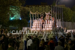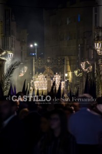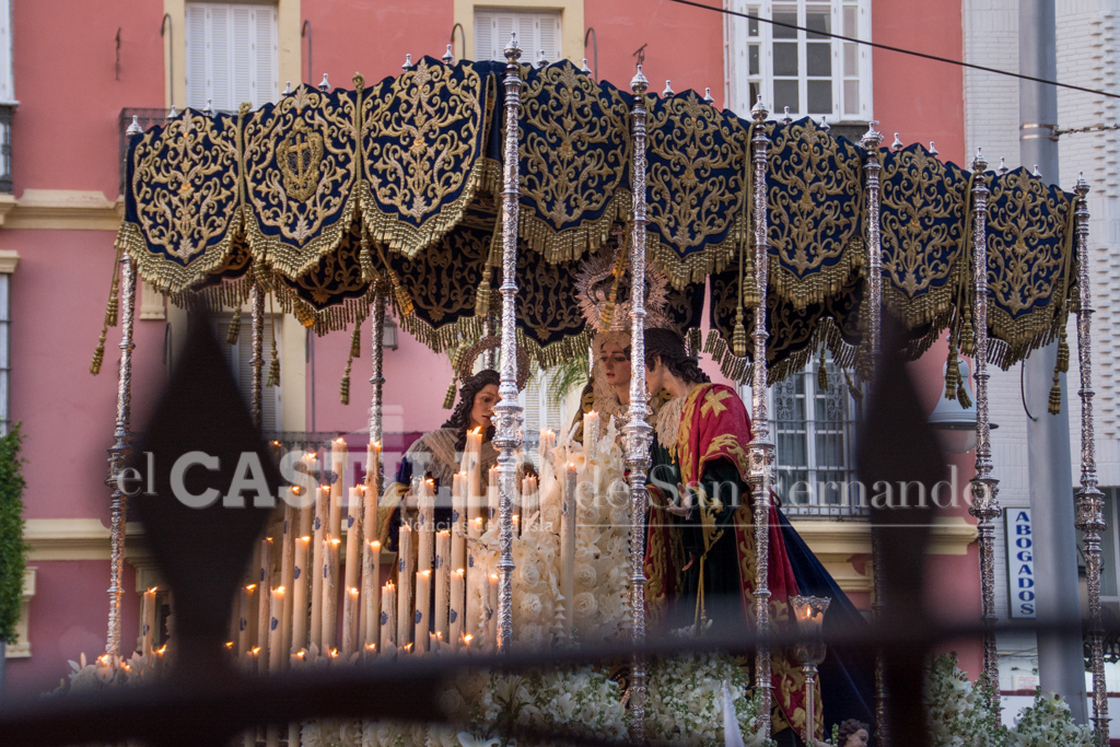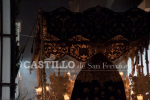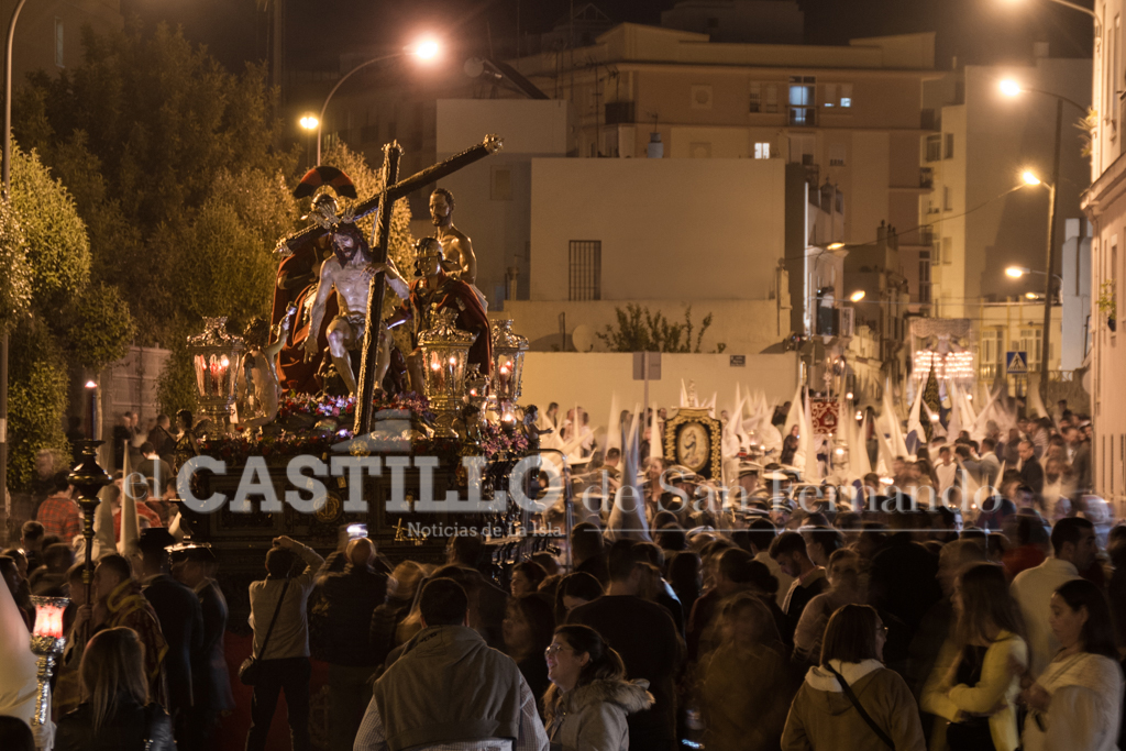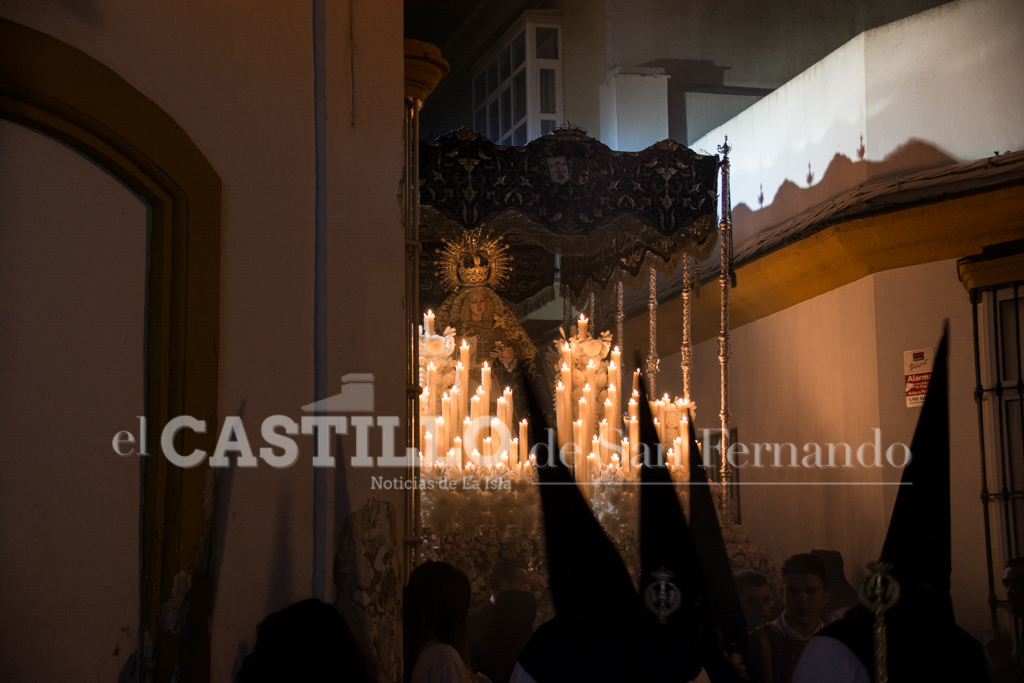 Y a las 18,20 se abrían las puertas de la Iglesia Mayor isleña par dar paso a la Hermandad de Columna, acompañada de sus hermanos con sus hábitos blancos y con capirotes de terciopelo morado, y a los sones la A.M. Nuestro Padre Jesús Nazareno de La Algaba, este año contaba con el estreno en el paso del Señor de la silla jamuga y sobre ella una clámide, realizada por el Taller Virgen del Carmen, de nuestra ciudad. El paso de la Virgen de las Lágrimas era acompañado por la Banda Enrique Montero de Chiclana.