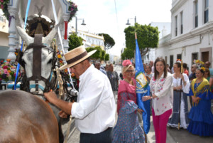 La alcaldesa en funciones, Patricia Cavada, ha entregado esta mañana la bandera de la Ciudad a la hermana mayor de la hermandad filial del Rocío de San Fernando, Ana Ortiz Benítez, para que la comitiva de romeros que acompañan al simpecado isleño camino de la aldea almonteña la porten representando así a la ciudad. Este gesto, ya convertido en habitual cada año, tiene lugar durante la mañana de partida de la hermandad desde San Fernando hasta Almonte dando así inicio a su peregrinación. Patricia Cavada, acompañada de miembros de la Corporación municipal, ha recibido a la comitiva a su paso por la sede actual de la Alcaldía, en la calle Real 63, y les ha deseado un buen camino.Los romeros isleños continuaron posteriormente su paso hacia la Iglesia Mayor y la Iglesia del Carmen para visitar al patrón San José y a la Patrona de San Fernando y de la Armada, la Santísima Virgen del Carmen. Posteriormente, tienen previsto salir de la ciudad para emprender su peregrinación hasta la aldea, donde la filial isleña tiene prevista su presentación a la Virgen del Rocío al mediodía del viernes.