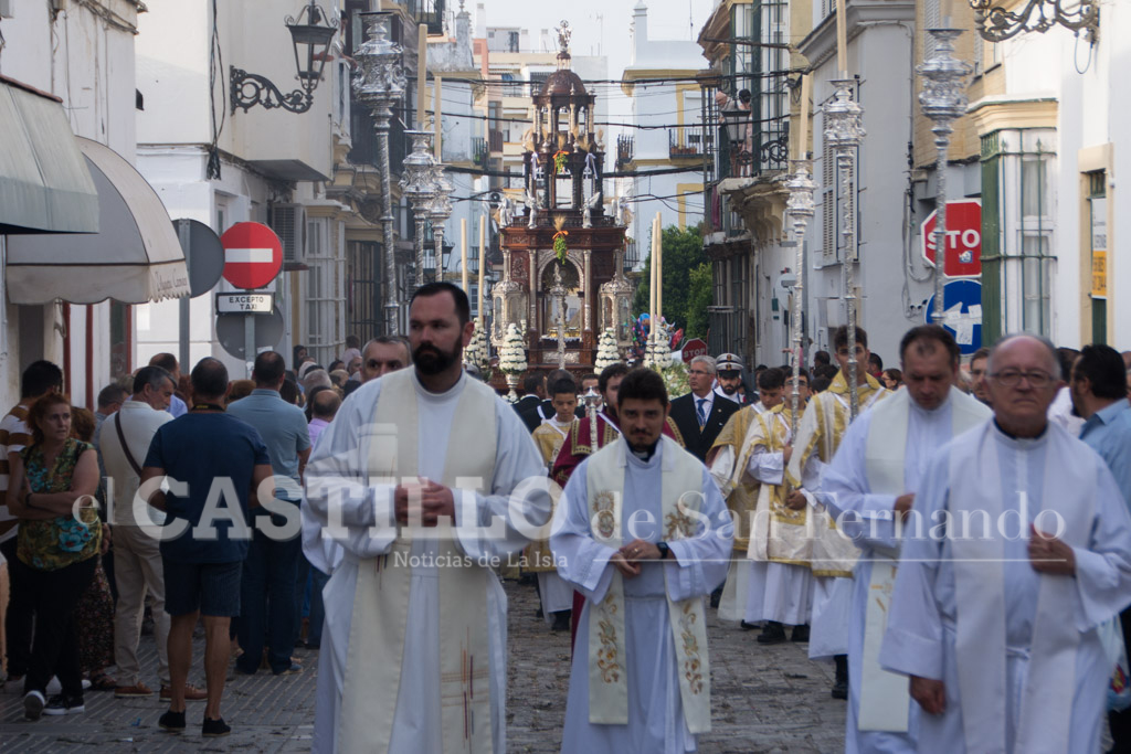 El obispo diocesano Rafael Zornoza Boy presidió la ceremonia y fue tras el Santísimo, en una procesión donde faltaron varios párrocos de San Fernando.