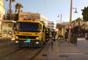 Los Bomberos retiran una cristalera dañada de la parada del tren tranvía en el Carmen