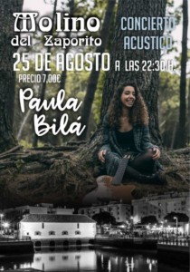 La cantante Paula BiláPaula Bilá, ofrecerá un concierto en acústico mañana domingo 25 de agosto a partir de las 22:30 horas en El Molino de Mareas del Zaporito. Entrada 7 euros hasta completar aforo.
