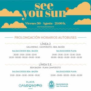 Para facilitar el traslado de todos los interesados en acudir al See You Sun, el Ayuntamiento establecerá un servicio especial de autobuses hasta la playa, de forma que ampliará su horario la línea 2 prolongación a Camposoto con la última salida prevista a las 02:05 horas de la madrugada.
