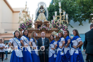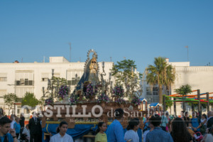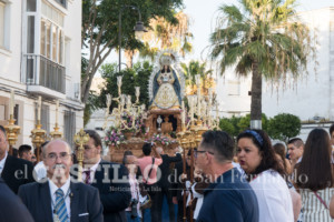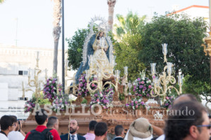 La banda de música del Nazareno acompañó el paso de la patrona de la barriada Bazán, que recordó en su salida al sacerdote Jesús Cortejosa Gómez, que fue el que compró la imagen de la Virgen al imaginero Juan González.