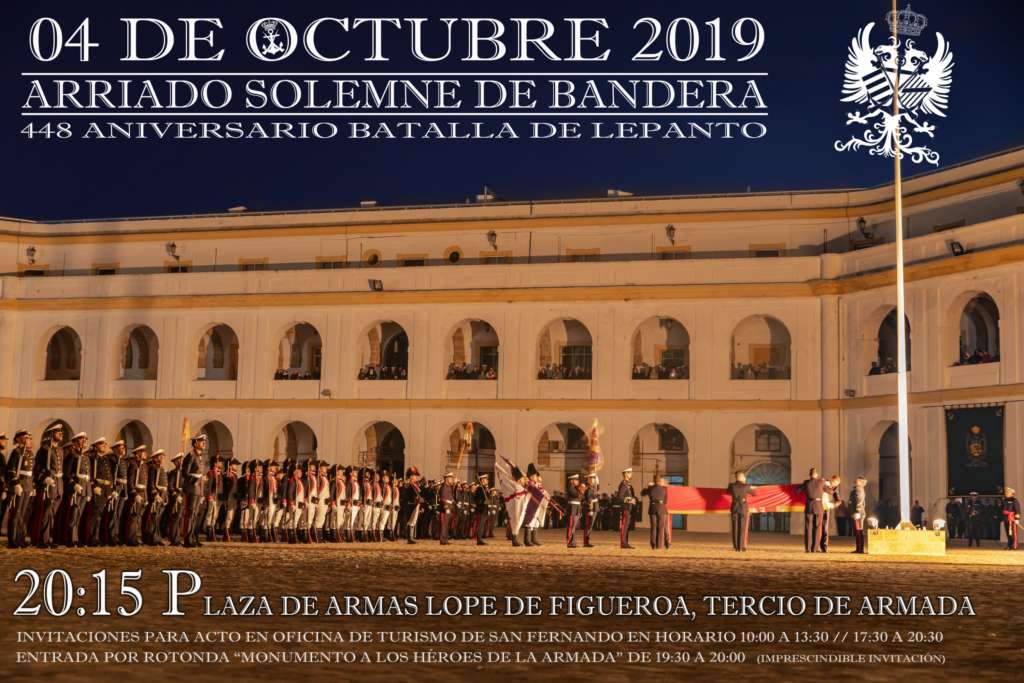 El próximo viernes 4 de octubre, a las 20:15 horas, con motivo de la conmemoración del 448º Aniversario de la Batalla Naval de Lepanto, tendrá lugar en el Patio de Armas Lope de Figueroa del Tercio de Armada, un acto de Arriado Solemne de Bandera. Participarán la Banda de Música del Tercio del Sur y, por parte del Tercio de Armada, dos compañÃas de fusiles, las banderas coronelas y cuatro obuses de 105 milÃmetros.