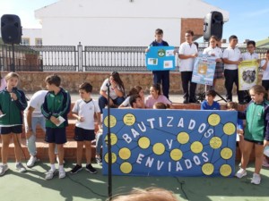 Por último, y como gesto final, alumnos y alumnas de 5º y 6º de Primaria de todos los colegios unidos, y como representantes de cada centro, se han reunido en el patio del colegio Compañía de María, uniendo los murales que cada centro ha confeccionado, formando un mural más grande y han leído, entre todos, el manifiesto remitido por el Secretariado Diocesano de Misiones.