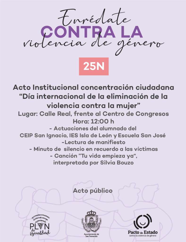 El Ayuntamiento de San Fernando conmemora mañana 25 de noviembre el Día Internacional de la Eliminación de la Violencia contra la Mujer con un acto que dará comienzo a las 12 de la mañana frente al Centro de Exposiciones y Congresos y que visibilizará y reivindicará la lucha contra la violencia de género y a favor de la igualdad en la ciudad.