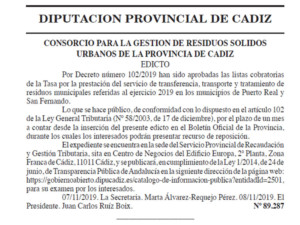 El anuncio del BOP, informado por el Consorcio para la Gestión de Residuos, señala que “por Decreto 10/2019 han sido aprobadas las listas cobratorias de la Tasa por la prestación del servicio de transferencia, transporte y tratamiento de residuos municipales referidas al ejercicio 2019 en los municipios de Puerto Real y San Fernando”.