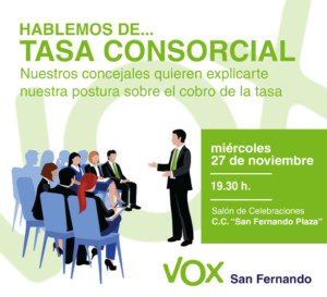 El grupo municipal de VOX en San Fernando ha presentado una actividad para hoy miércoles 27 de noviembre en referencia a la postura del partido sobre la conocida como 'Tasa Consorcial'.
