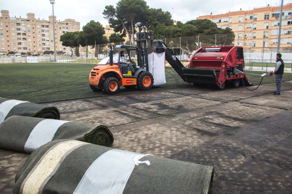 Comienza la sustitución del césped sintético del campo de la Bazán