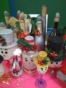 Las botellas de cristal se pintan primero con spray de color rojo plateado o dorado y una vez secas se adornarán con lazos, cintas de raso y con lo que se tenga más a mano de diferentes adornos de Navidad, como por ejemplo; paquetitos, bolitas, campanitas ... hasta conseguir el efecto final es el que se ve en la fotografía.