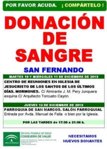 El Centro de Transfusión, Tejidos y Células de Cádiz (CTTC Cádiz) piden a la población de San Fernando que hoy martes 10, mañana 11, el jueves 12, y el miércoles 18 de diciembre acudan por la tarde a donar sangre en horario de 17:30 a 21:30 horas.