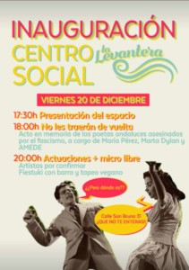 La asociación juvenil 'La Levantera' inaugura el próximo viernes 20 de diciembre a las 17:30 horas el Centro Social Juvenil Autogestionado “La Levantera”, situado en la calle San Bruno, 31, con un programa de presentación del proyecto, un homenaje a los poetas andaluces víctimas de la dictadura y una sesión artística de micro abierto para gente joven.