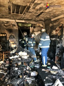 Cuando llegan los Bomberos el incendio se encuentra en fase muy desarrollada en el salón de la vivienda, por lo que se disponen dos equipos, uno para comenzar a sofocar y otro en labores de búsqueda de posibles personas en el interior.