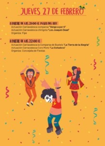 La comparsa de Bustelo "La Tierra de la Alegría" desde Cádiz y las agrupaciones carnavalescas locales: la chirigota "Los niños pródigo", la comparsa "Vengo a por ti" y el coro de La Isla "La Soñadora".