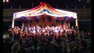 Terminando el pregón de nuevo en el escenario de la Plaza del Carnaval, actuó el Coro de La Isla “La Soñadora”, el cual por segundo año consecutivo estuvo en fase de cuartos de final en el COAC 2020 en el Gran Teatro Falla. Seguidamente actuó uno de los platos fuertes venidos de la capital gaditana: La comparsa de Juan Carlos Aragón “La Eterna Banda del Capitán Veneno”.