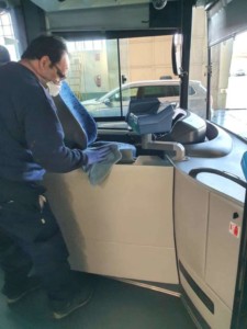 En lo que afecta a los autobuses se limpiará el puesto de conducción con la aplicación de una solución desinfectante en la cabina de conducción y se procederá a la aplicación de solución desinfectante a los distintos elementos y superficies susceptibles de poder contener presencia del coronavirus. También se desinfectará todo el recinto de viajeros con una solución desinfectante como paramentos verticales y barras de