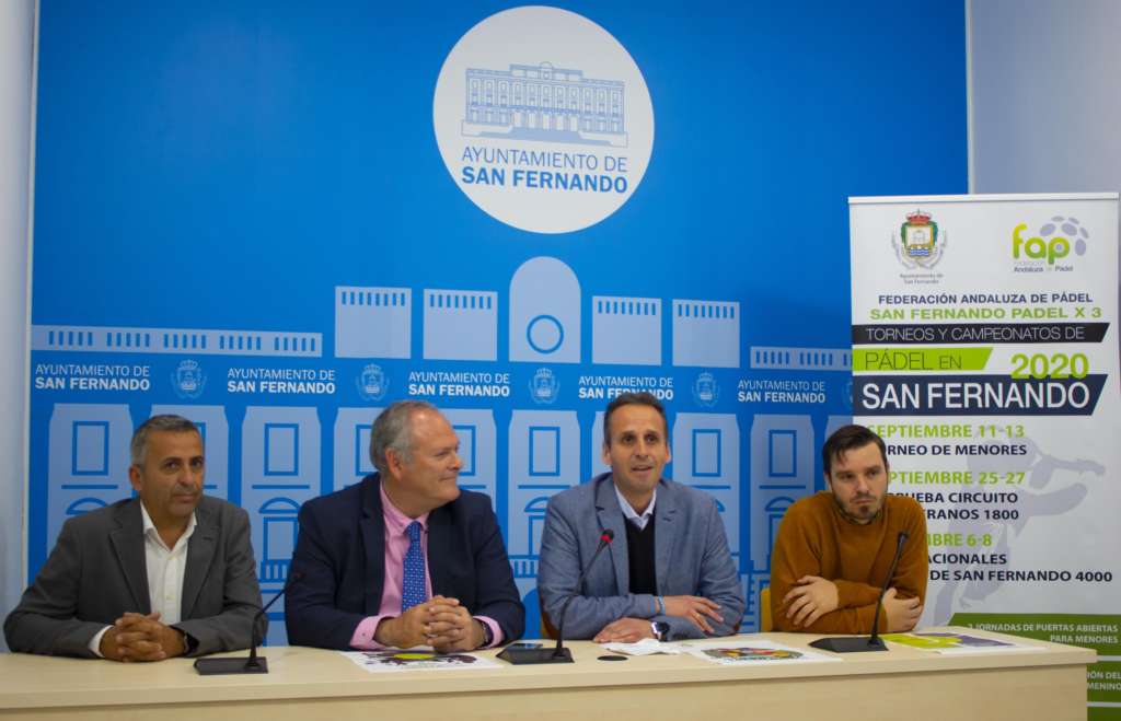El cuarto teniente de alcaldesa, Antonio Rojas, y el concejal de Actividades Deportivas, Francis Posada, junto al presidente de la Federación Andaluza de Pádel, José Pérez, y el presidente de la Federación Gaditana de Pádel, Francisco Pérez de Gracia, han presentado una actividad donde San Fernando se convertirá en sede de varios eventos de pádel que abarcarán todas las categorías existentes en este deporte. Estos se llevarán a cabo entre los meses de septiembre y noviembre en las instalaciones deportivas de Bahía Sur. Además, para ampliar esta oferta se incluye una serie de actividades paralelas que se realizarán con motivo de la celebración de estos torneos.