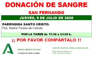 Una vez más desde el Centro de Transfusión, Tejidos y Células de Cádiz pide a la población isleña que este jueves 9 de julio acudan por la tarde a donar sangre (de 17:30 a 21:30 horas) a la plaza María Teresa de Calcuta de San Fernando.