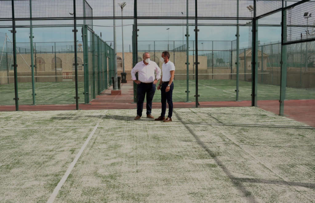 Los concejales de Infraestructura y Espacios Deportivos, Antonio Rojas, y Actividades y Desarrollo del Deporte, Francis Posada, han visitado este martes las pistas de pádel que el Ayuntamiento de San Fernando ha reformado en la Ciudad Deportiva de Bahía Sur.