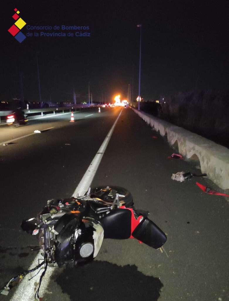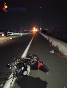 Bomberos del Consorcio de Bomberos de la Provincia del parque de Cádiz han intervenido esta pasada noche en un accidente de tráfico ocurrido en la CA-33, km 3, a la altura del Ventorrillo del Chato, sentido San Fernando. El siniestro tiene lugar cuando una moto de gran cilindrada impacta por alcance en la zona trasera de un turismo, quedando el conductor de la moto prácticamente incrustado en el vehículo, falleciendo en el acto. Bomberos procede a descarcelar parte del vehículo y a retirar el techo del mismo para poder rescatar el cuerpo del motorista.