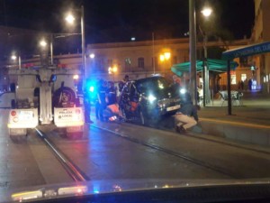 Los viandantes que paseaban hace escasos minutos en la noche de este miércoles por la céntrica calle Real, concretamente a la altura de la plaza Iglesia, se han llevado una enorme sorpresa al comprobar que un turismo que circulaba dirección Capitanía se había subido a una de las aceras elevadas instaladas para acceder a las diferentes paradas del Tren Tranvía de la Bahía de Cádiz.