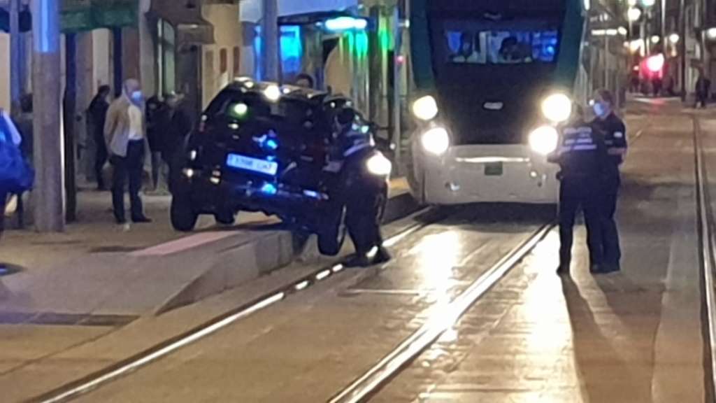 La imagen que ilustra esta noticia refleja como curiosidad, que en el momento en que el vehículo se encontraba estacionado sobre la acera se acercaba circulando en uno de los trayectos de prueba una unidad tranviaria por la céntrica calle de San Fernando.