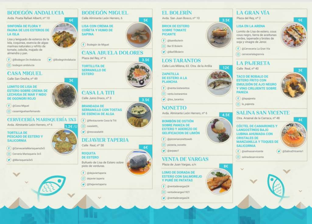 Los participantes ofrecerán diversas tapas o platos a precios populares que tendrán como denominador común el uso del pescado y los productos de estero como ingrediente principal. Cada hostelero que toma parte en esta ruta ha establecido el precio y el tamaño de sus propuestas, que también serán sometidas a concurso y valoradas por un jurado que emitirá su fallo con posterioridad.