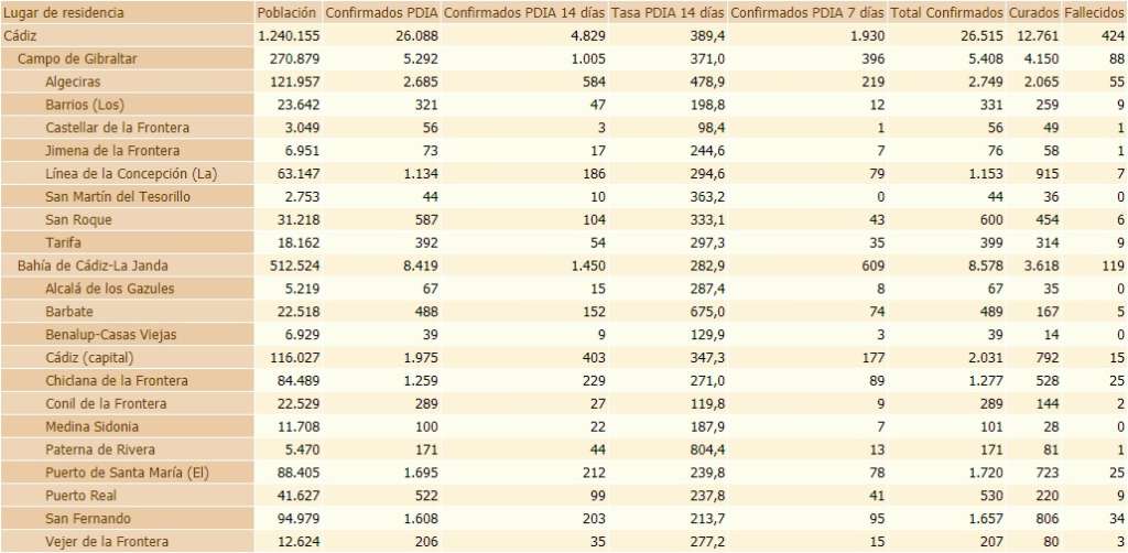 En cuanto al número de fallecidos, desde que la Junta diese a conocer la semana pasada de las siete muertes registradas en un solo día, los datos han sufrido una variación al registrarse una muerte más, alcanzando ya los 34 fallecidos en San Fernando por la Covid-19. El distrito sanitario Bahía de Cádiz La Janda, contabiliza un total de 119 fallecidos, dos más que la semana pasada. donde el municipio isleño sigue siendo donde se han registrado más decesos por la enfermedad de la Covid-19 hasta el momento.