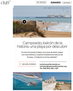 En la publicación del mes de julio, revista número 52, página 18, el protagonismo lo ha copado la playa de Camposoto, donde resaltan su belleza, al enclavarse en un paraje natural único y su historia que culmina en la fortaleza del Castillo de Sancti Petri. Además, la califican como una de las últimas joyas de la costa de Cádiz.
