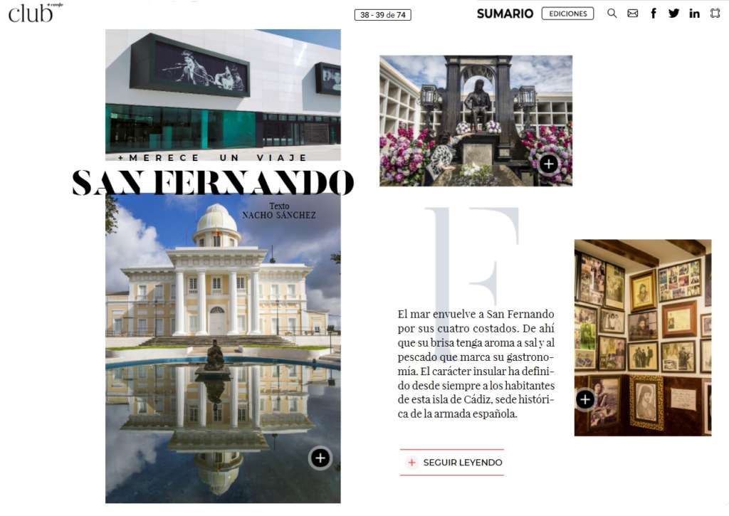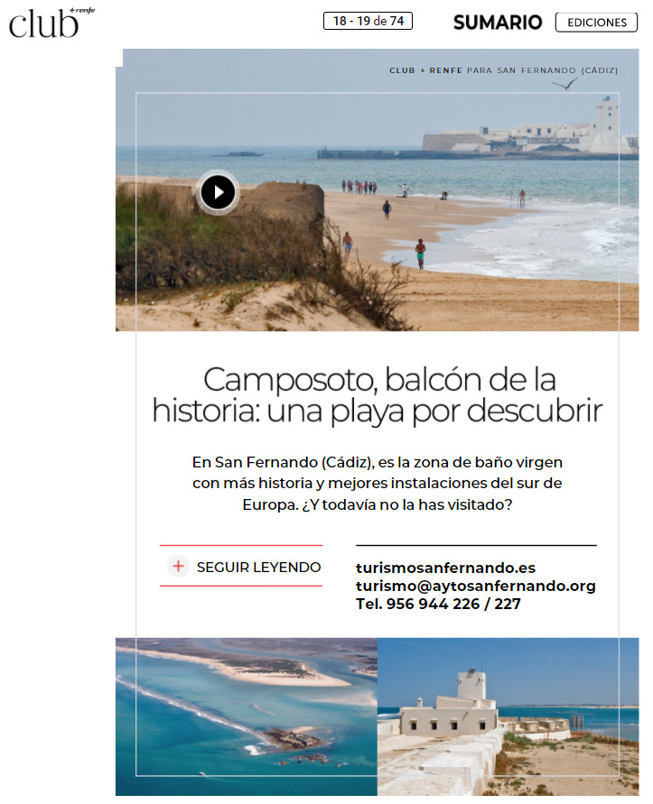 San Fernando ha sido protagonista en la revista del Club+Renfe de los meses de agosto y septiembre. Ambas publicaciones se enmarcan dentro de una estrategia de promoción de la ciudad que pretende ampliar fronteras y que, en este caso los usuarios del tren, se adentre en la gastronomía, patrimonio, cultura y naturaleza existente en la ciudad.
