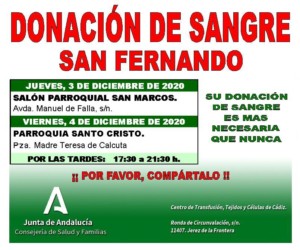 El Centro de Transfusión, Tejidos y Células de Cádiz (CTTC Cádiz) pide a la población de San Fernando que acudan por la tarde mañana jueves 3 de diciembre a donar sangre en horario de 17:30 a 21:30 horas en el Salón Parroquial San Marcos, ubicado en la Avenida Manuel de Falla, s/n.