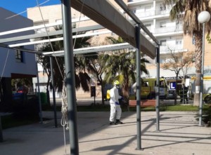 De la misma forma prosigue en funcionamiento el dispositivo especial de desinfección diaria en el entorno de los centros de salud, así como el baldeo de desinfección que acompaña a la limpieza viaria y que se realiza en todas las zonas de la ciudad.