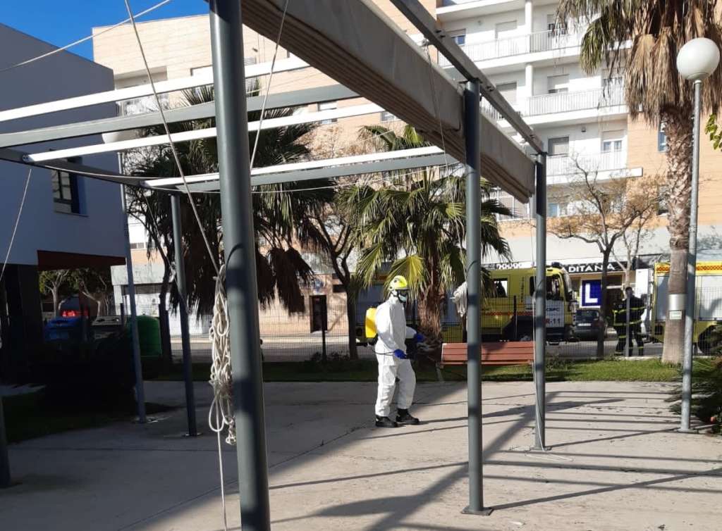 El Parque de Bomberos de San Fernando acudió en la jornada de ayer, jueves 3 de diciembre, a desinfectar la Residencias de Mayores isleña Vitalia Bahía de Cádiz para tratar tanto sus espacios interiores como exteriores y zonas comunes frente a la pandemia del coronavirus.