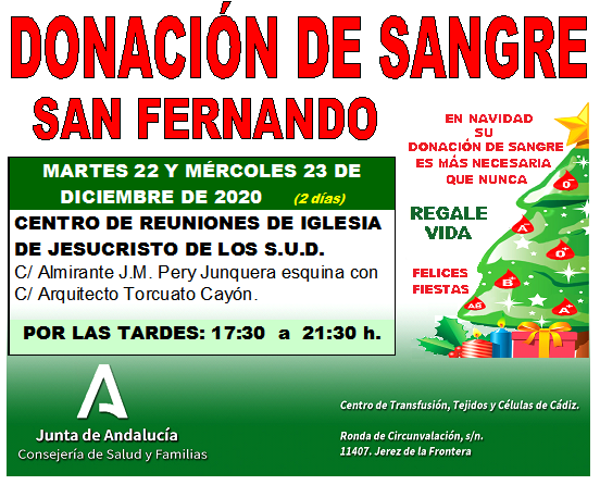 Una vez más desde el Centro de Transfusión, Tejidos y Células de Cádiz piden a la población isleña al igual que el pasado viernes 18 de diciembre donaron sangre, convocan una nueva recolecta para este martes y miércoles 22 y 23 de diciembre en el Centro de Reuniones de Iglesia de Jesucristo de los (SUD) calle JM Almirante Pery Junquera esquina con la calle Arquitecto Torcuato Cayón, en horario de tarde a donar sangre (de 17:30 a 21:30 horas).