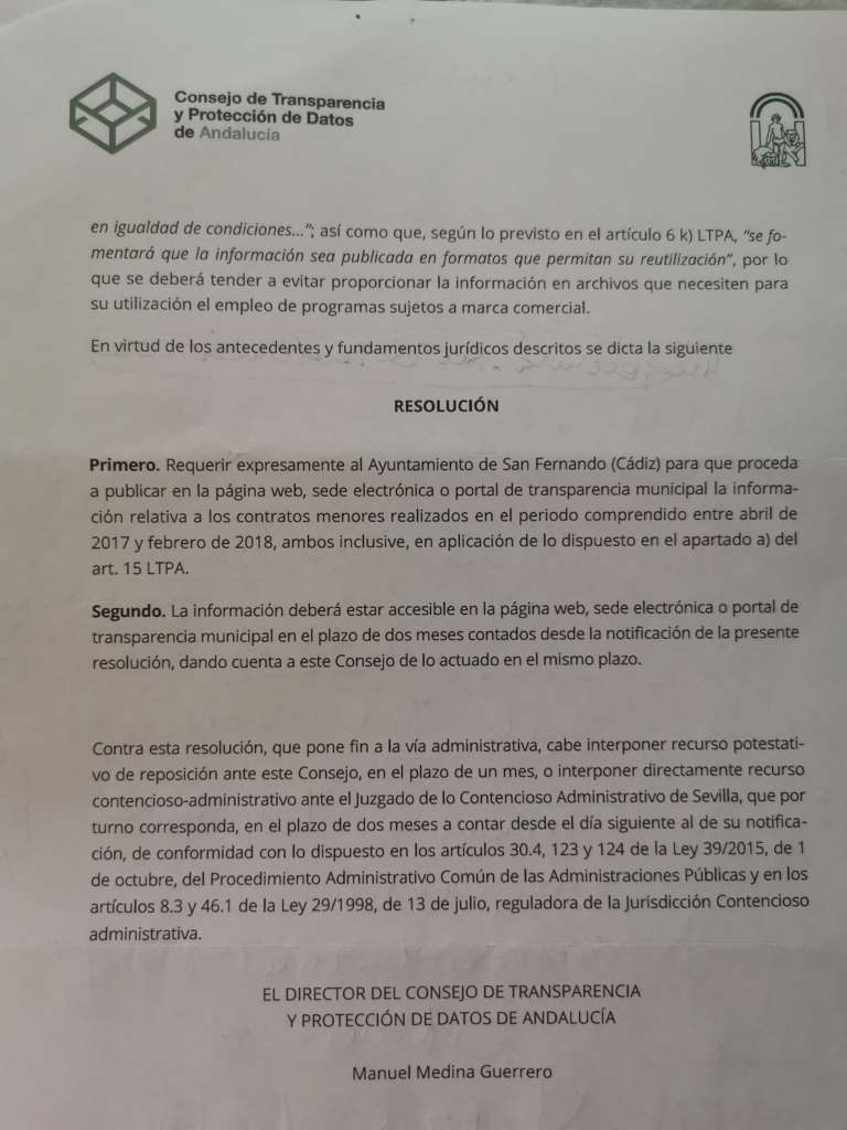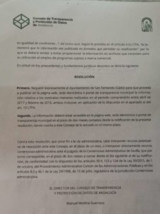 El Gobierno local de San Fernando en el mes de abril de 2017, por aquella época formado por PSOE-PA, dejó de publicar en la web municipal los contratos menores cuando observó que entraron en el debate político. Después de varias peticiones en el Registro, posteriormente la intervención del Consejo de Transparencia, luego de una resolución en febrero de 2020 ignorada y tras un incidente de cumplimiento, finalmente la alcaldesa isleña Patricia Cavada acata el cumplimiento de la Ley y los derechos que asisten a los isleños.