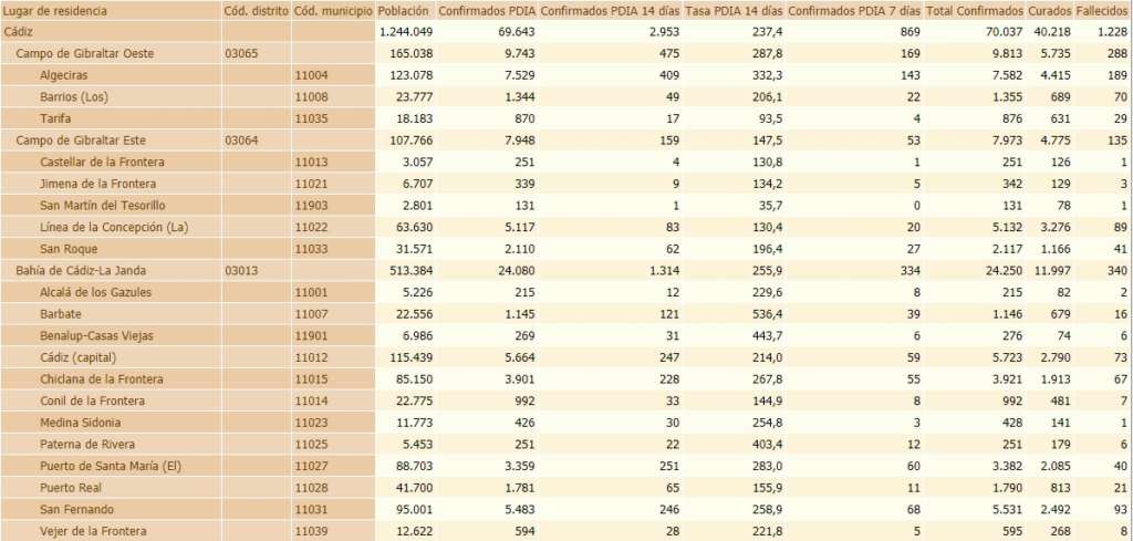 En el caso de Cádiz: 5 brotes que suman un total de 27 casos en los distritos sanitarios de BahÃa de Cádiz-La Janda (un brote de 7 casos), Jerez Costa-Noroeste (dos brotes de 4 y 4 casos), distrito Campo de Gibraltar Este (un brote de 8 casos) y distrito Sierra de Cádiz (un brote de 4 casos).