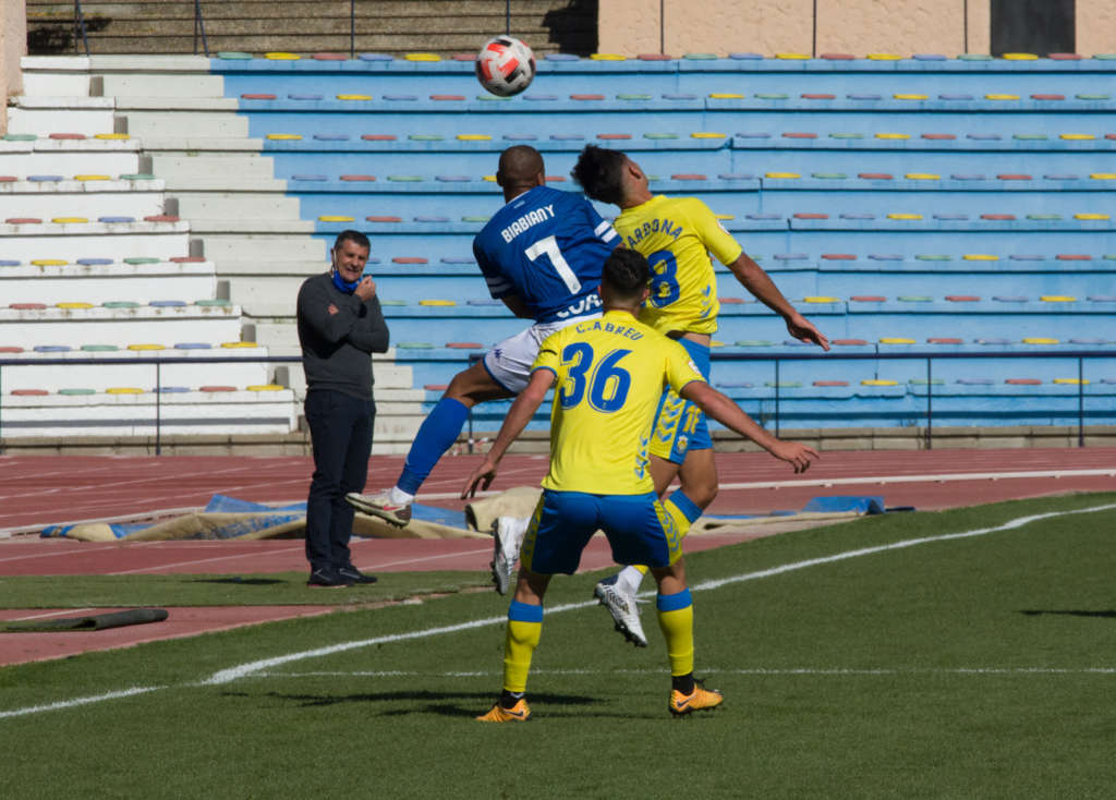 La respuesta no tardó en llegar por parte de los azulinos y Lolo González, tras un rechace a disparo de Hugo Rodríguez, pudo hacer el primero de la mañana en el Estadio Iberoamericano 2010, pero su testarazo se marchaba desviado de la portería grancanaria.