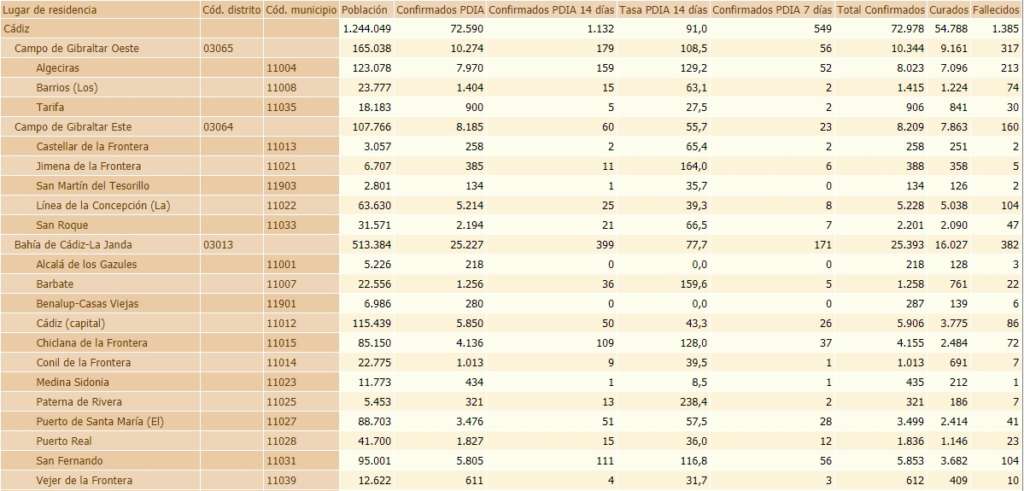 Datos acumulados en la provincia de Cádiz, remitidos al Ministerio de Sanidad