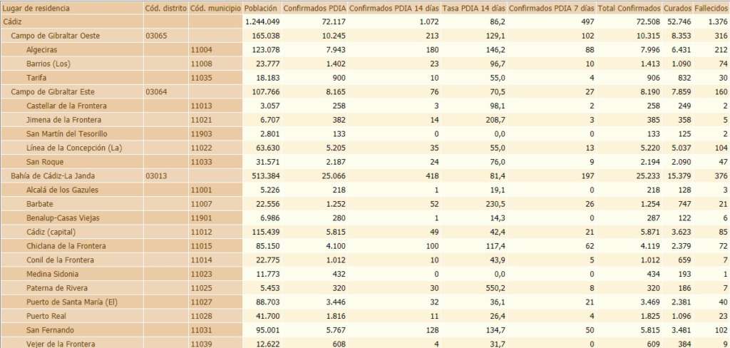Datos acumulados en la provincia de Cádiz, remitidos al Ministerio de Sanidad