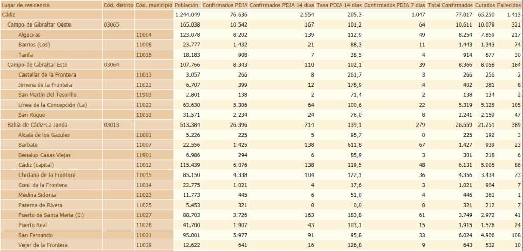 Datos acumulados en la provincia de Cádiz, remitidos al Ministerio de Sanidad