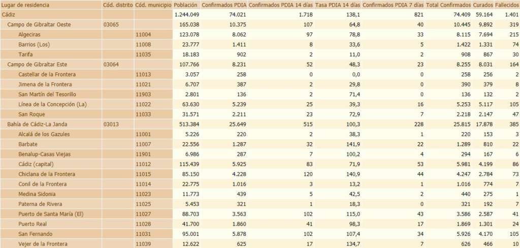 Datos acumulados en la provincia de Cádiz, remitidos al Ministerio de Sanidad