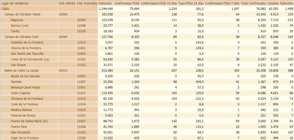 Datos acumulados en la provincia de Cádiz, remitidos al Ministerio de Sanidad