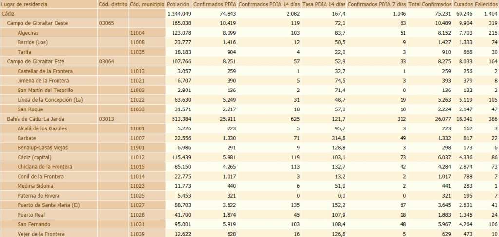 Datos acumulados en la provincia de Cádiz, remitidos al Ministerio de Sanidad