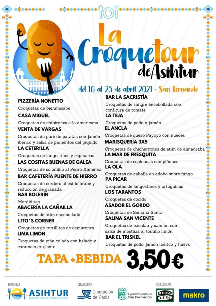 'La Croquetour 2021' contará con la colaboración del Ayuntamiento de San Fernando, la Diputación Provincial de Cádiz y Onda Cero Radio y con el patrocinio de Makro. El acto de presentación ha contado con la intervención del periodista jerezano Jaime Álvarez, conductor del magazine 'Más de Uno Bahía de Cádiz', de Onda Cero Radio. Álvarez ha ofrecido un particular 'Pregón a la Croqueta' en clave de humor en el que ha escenificado la defensa ante un tribunal de un trabajo de fin de máster sobre este producto gastronómico y la presentación de la candidatura ficticia de San Fernando como capital europea de la croqueta.