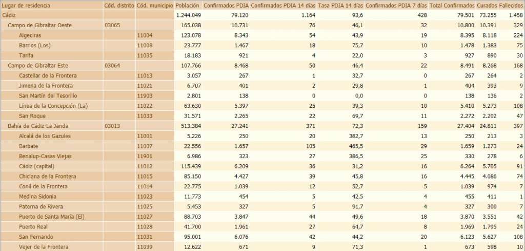 Datos acumulados en la provincia de Cádiz, remitidos al Ministerio de Sanidad