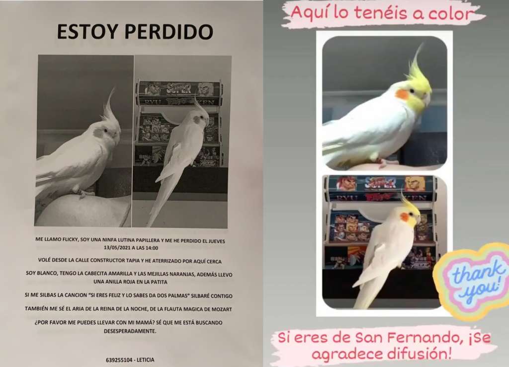 El ave se perdió en la zona de La Casería en San Fernando en la jornada de este jueves 14 de mayo sobre las 14:00 horas, su dueña lleva desde entonces buscándolo de manera desesperada y para ello está pegando carteles por distintas zonas de la localidad isleña con el fin de encontrar su paradero.